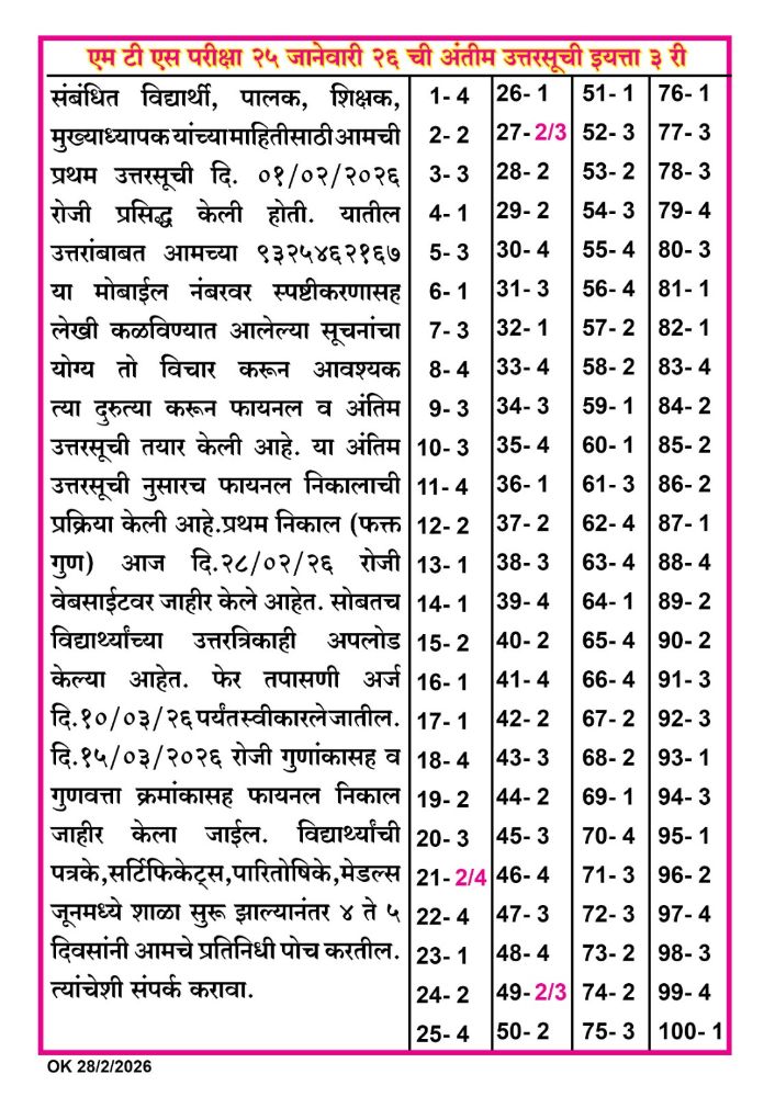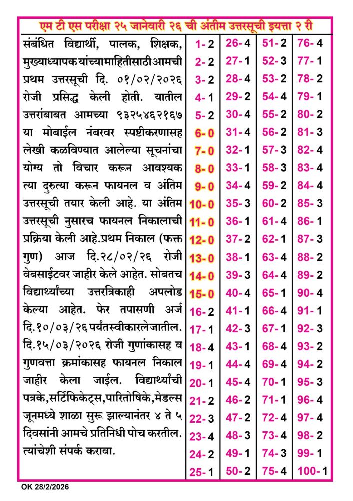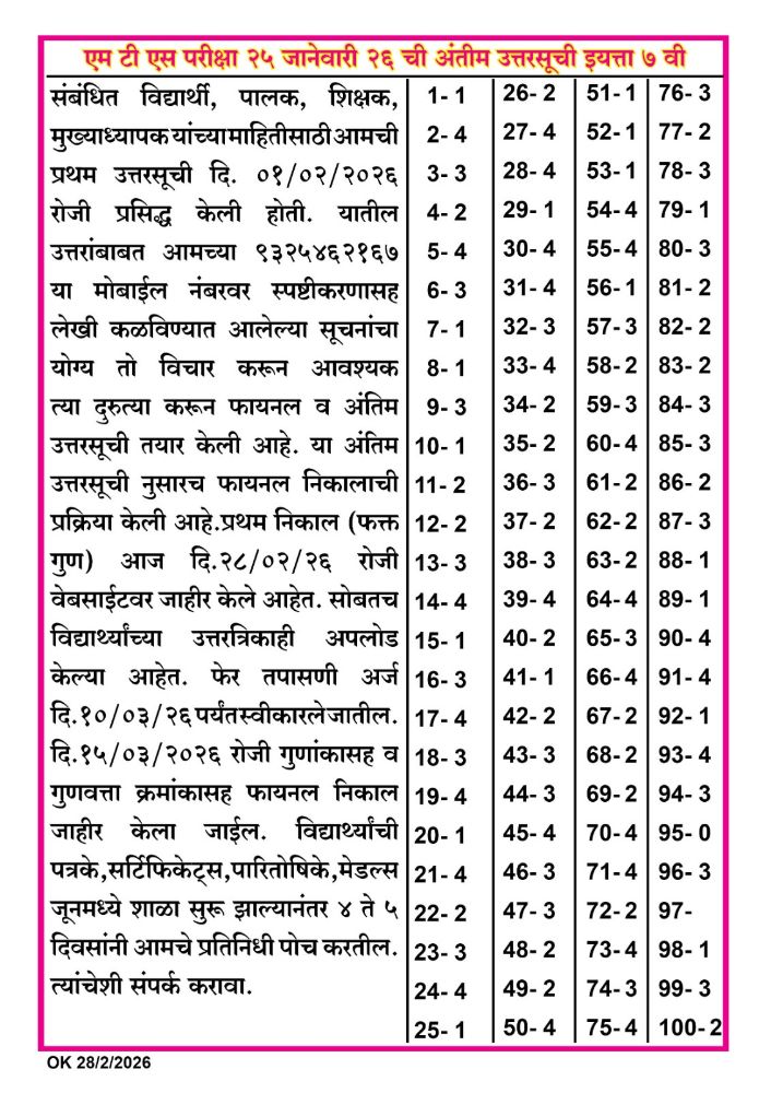 उत्तरसूची इयत्ता ७ वी २०२६