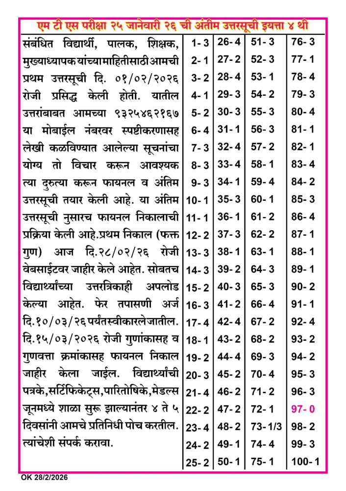 उत्तरसूची इयत्ता ४ थी २०२६